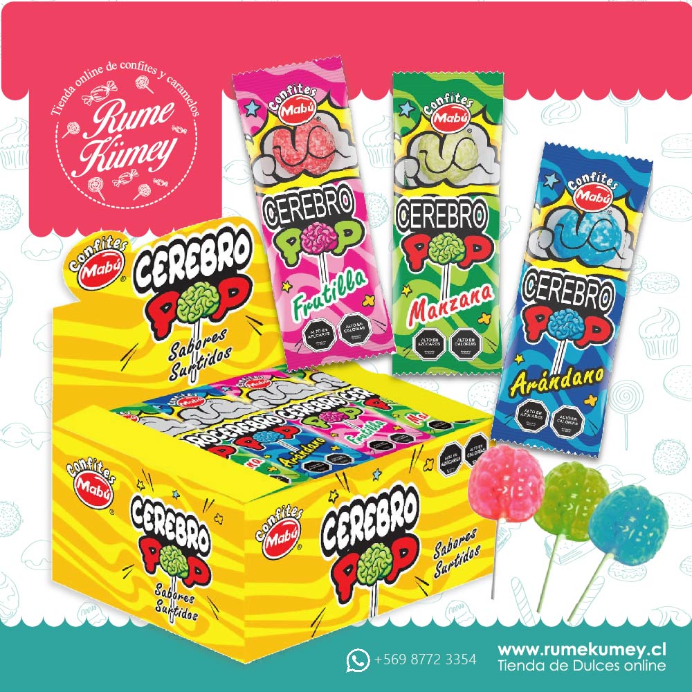 disfruta de estas ricas y novedosas Cerebro Pop con Chicle Sabores Surtidos. llevatelas en su formato display de sabores surtidos frutilla, manzana y arandanos. producto de la marca mabu.