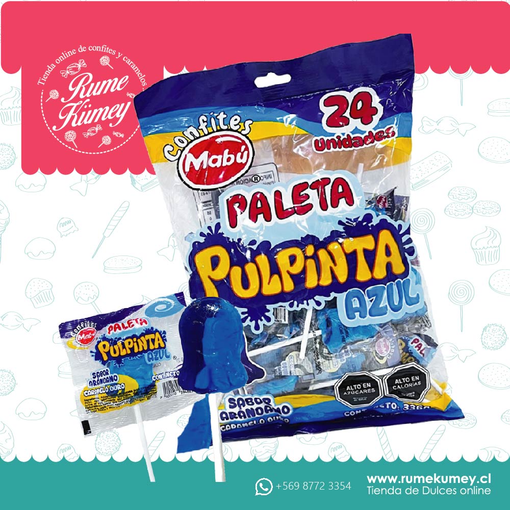 disfruta de estas ricas, hermosas y novedosas paletas de caramelo con forma de pulpo que ademas pinta boca de un llamativo color azul. esta producto esta disponible en formato de 24 unidades. sabor arandanos marca mabu